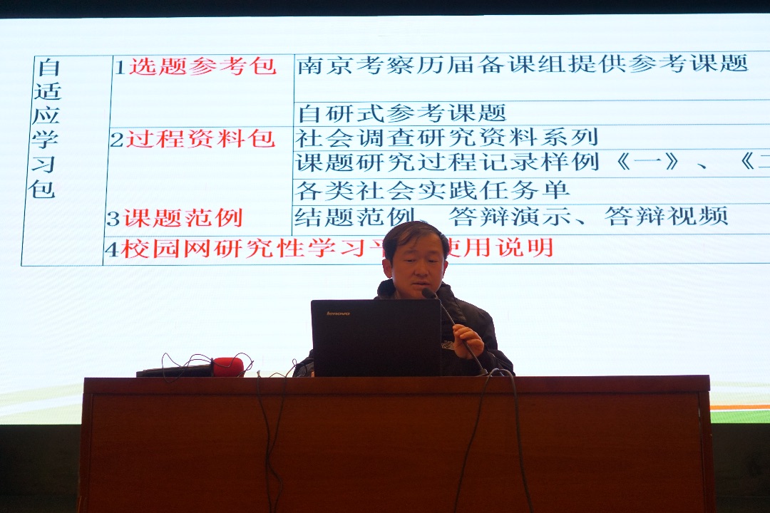 讲座伊始,杨小知老师深入阐述了研究性课题对高中生全面发展的重要意义。他指出,研究性学习不仅是高中学习的重要组成部分,更是培养批判性思维、问题解决能力和团队协作精神的关键路径。随后,杨老师就课题选题原则、研究流程及时间节点进行了系统说明,特别强调了开题、过程性资料、结题与考核等关键环节的时间安排,并现场演示如何高效利用校园网上的“自适应学习包”资源,为学生提供切实可行的操作指南。